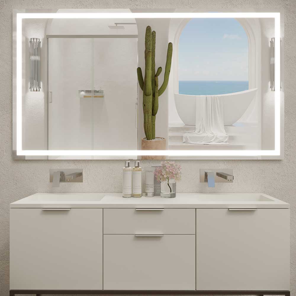 Está fabricado con una luna lisa en estructura con bastidor de ABS en la parte trasera. Varía la potencia según el tamaño del espejo. Tienes la opción de escogerlo en tres tipos de luces; Luz fria (6000ºK), Luz neutra (4500ºK), Luz cálida (3200ºK).