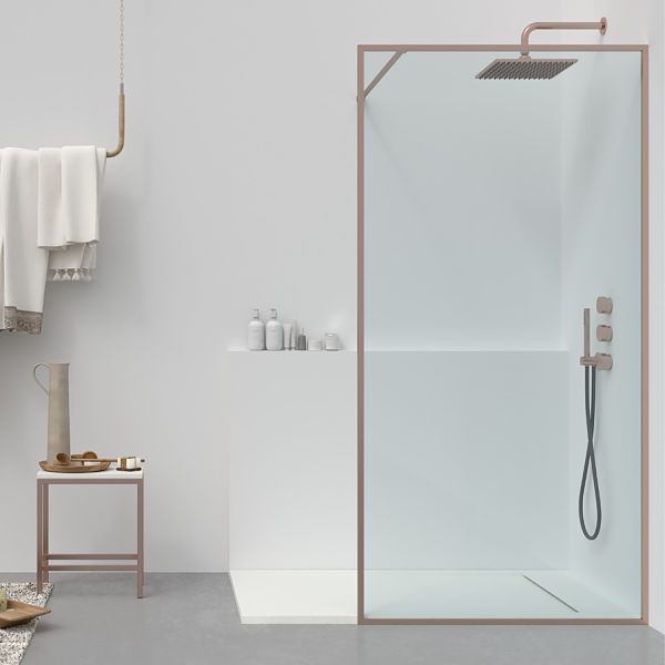 Su preciosa perfilería minimalista de tan solo 1,5 cm (perfil a pared y brazo de sujeción extensible) ofrece un detalle único y elegante a una mampara de una única hoja de cristal incoloro de 8 mm . con tratamiento anti-cal incluido.