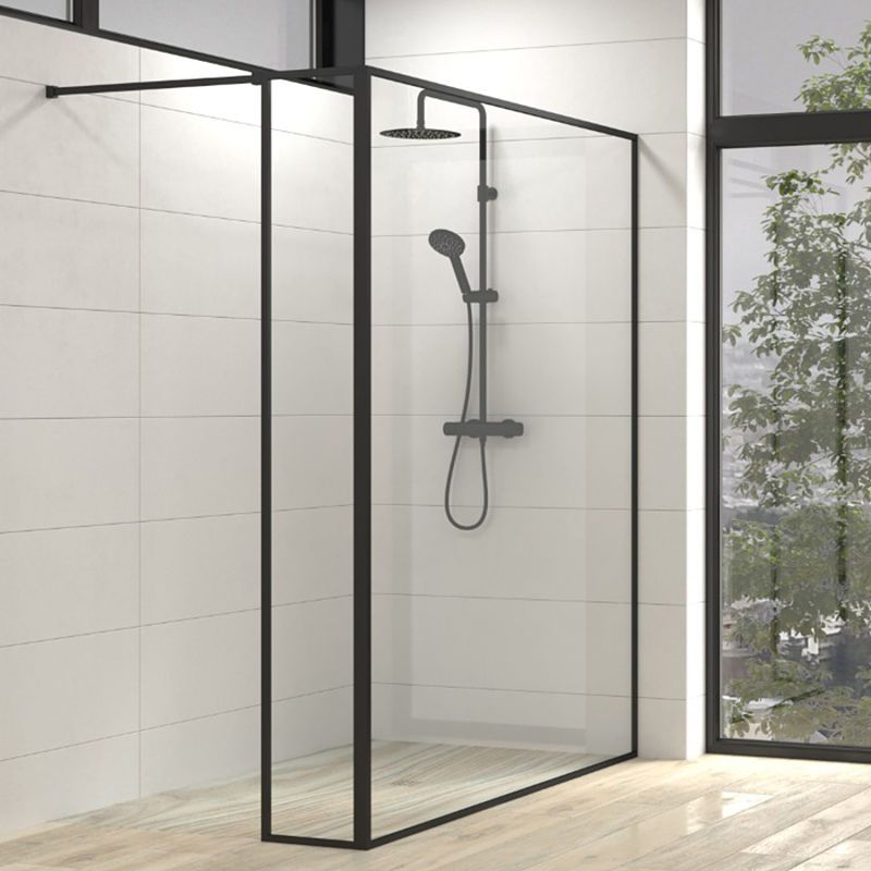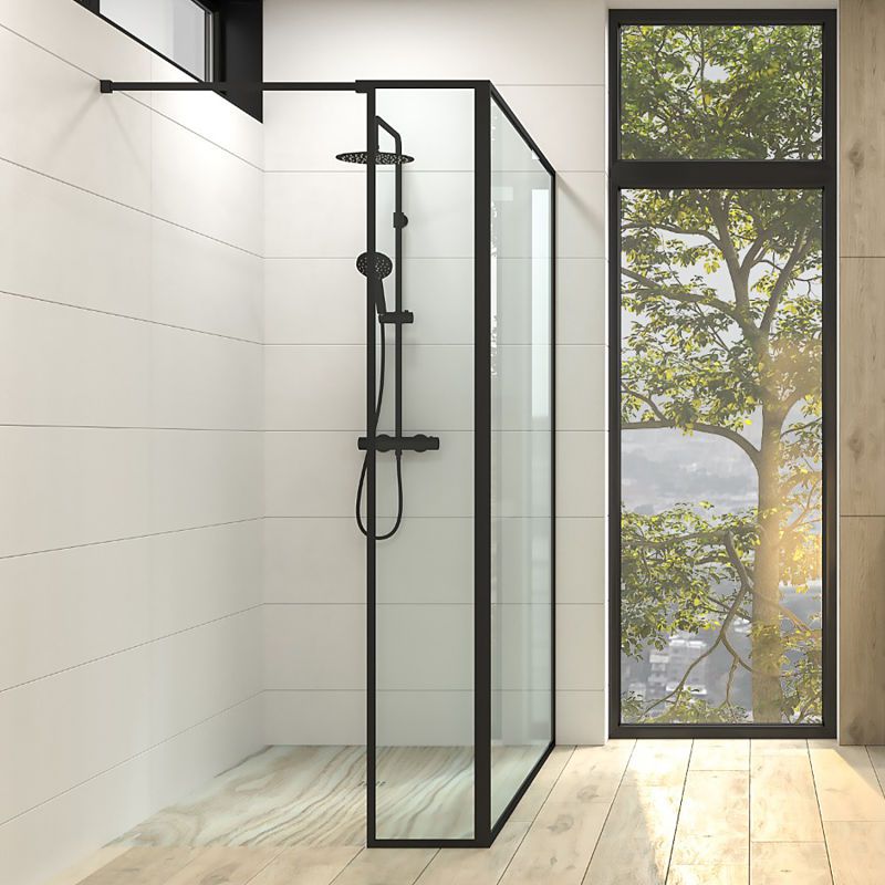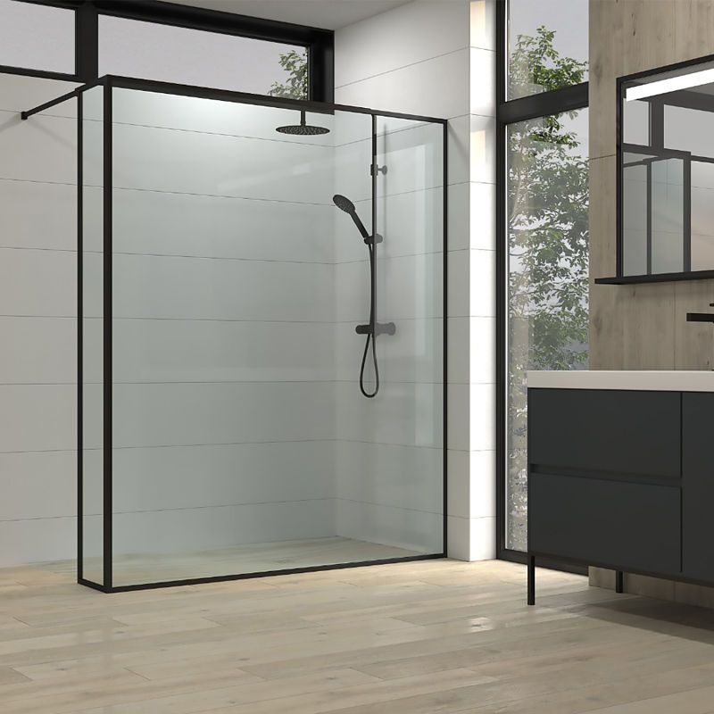 varobath line negro5 opt.jpgFijo de ducha a medida mampara LINE con perfilería extra enmarcada 2 cuerpos – Vidrio 4 MM con tratamiento anti-cal incluido- Brazo sujecci?n acero inox