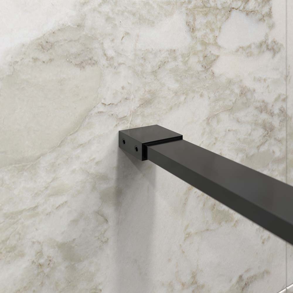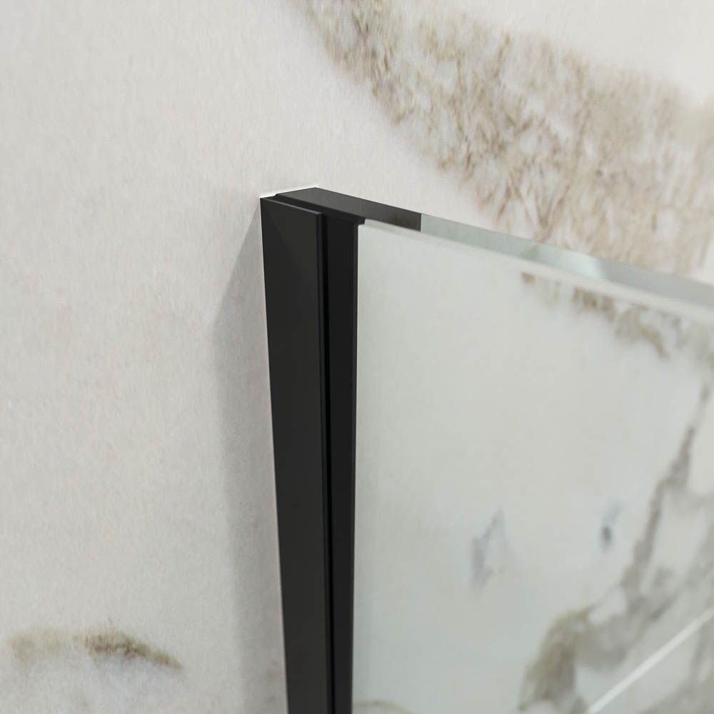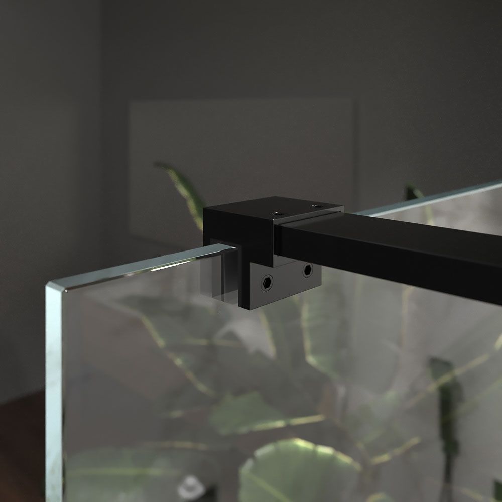La mampara fijo de ducha ZEN lleva vidrio templado de 10 mm de espesor, un pequeño perfil a pared en acero inoxidable termolacado NEGRO MATE y un brazo de sujeción de acero hasta 100 cm para dar mayor estabilidad a la mampara de ducha.