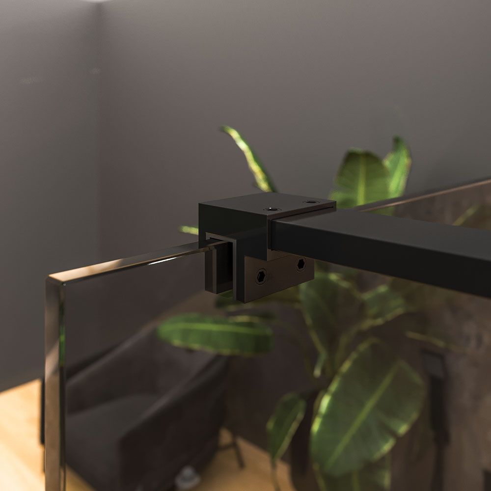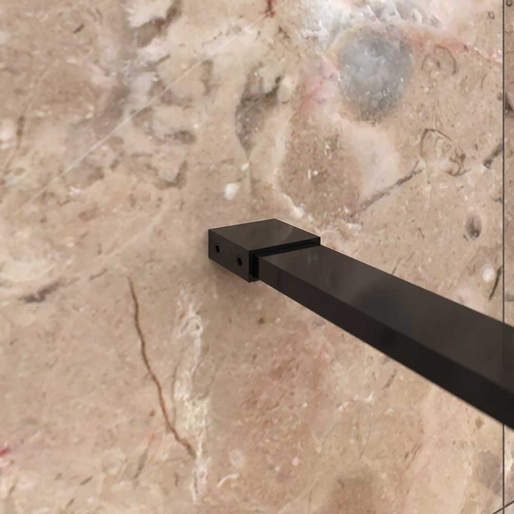 La mampara fijo de ducha ZEN lleva vidrio templado de 10 mm de espesor, un pequeño perfil a pared en acero inoxidable termolacado negro mate y un brazo de sujeción de acero hasta 100 cm para dar mayor estabilidad  a la mampara de ducha.