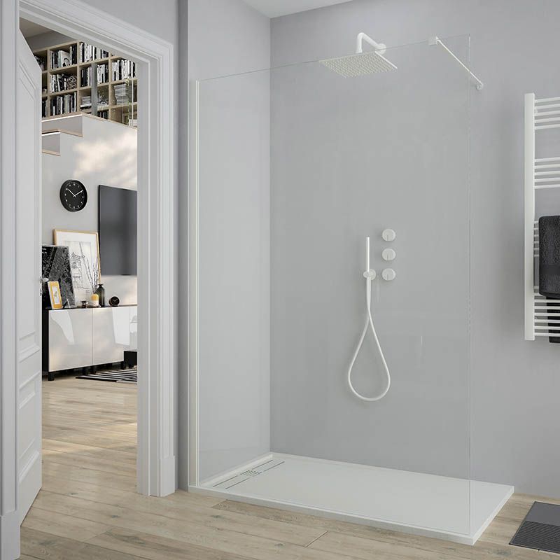 La mampara fijo de ducha ZEN lleva vidrio templado de 8 mm de espesor, un pequeño perfil a pared de aluminio blanco mate y un brazo de sujeción de acero extensible de 70cm a 100 cm acabado en blanco mate para dar mayor estabilidad a la mampara de ducha.