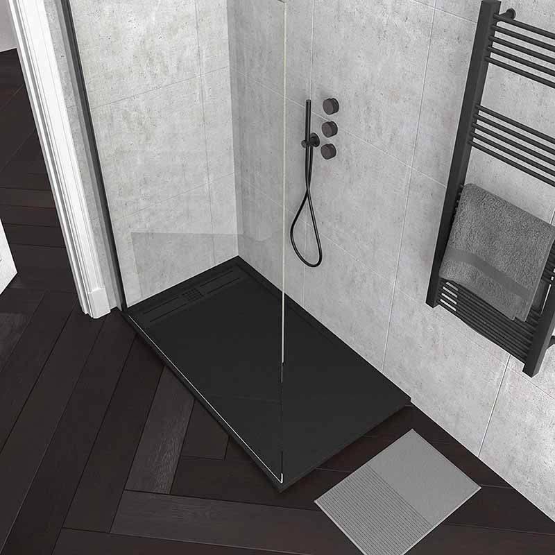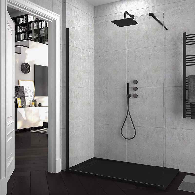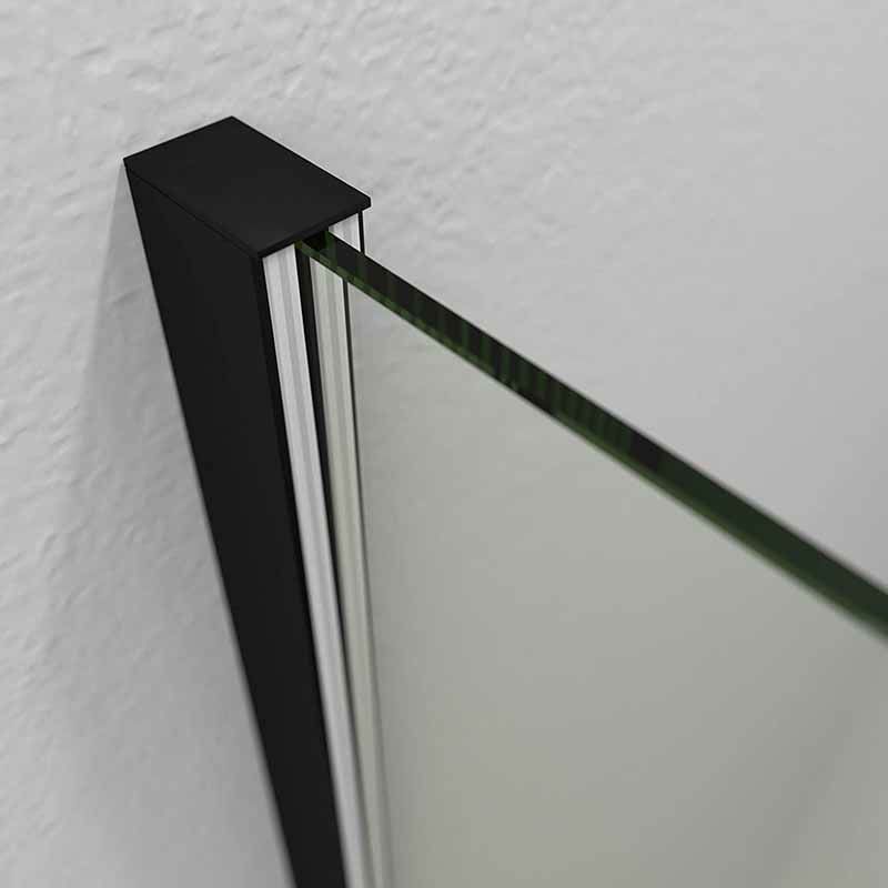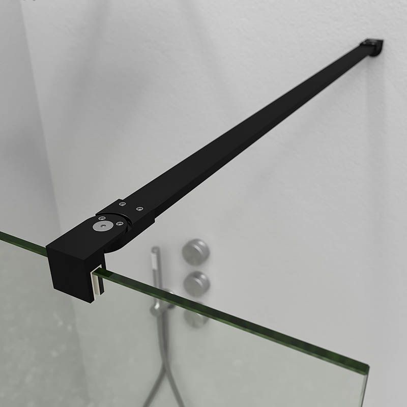 La mampara fijo de ducha ZEN lleva vidrio templado de 8 mm de espesor, un pequeño perfil a pared de aluminio negro mate y un brazo de sujeción de acero extensible de 70cm a 100 cm acabado en negro mate para dar mayor estabilidad a la mampara de ducha.