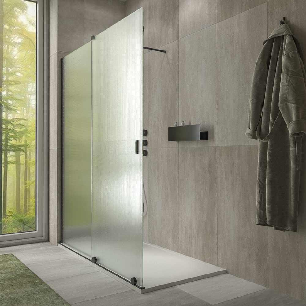 La perfilería y los complementos son de acero inoxidable terrmo lacado y el vidrio es de 8 mm acanalado . Esto la convierte en una mampara de ducha corredera resistente al desgaste que, además, cuida los detalles de diseño.