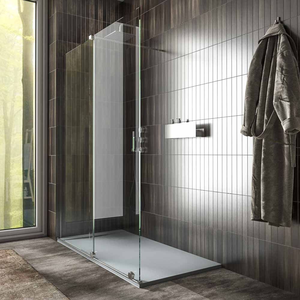 - Compuesta por una hoja fija y una corredera. La hace perfecta para colocar en baños abigarrados ya que admite obstáculos cerca de la parte fija y la puerta no necesita espacio extra para abrirse. Además, deja un amplio acceso.