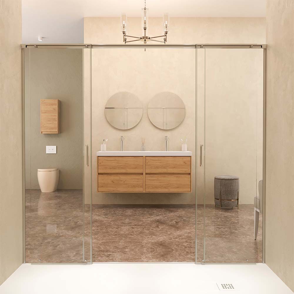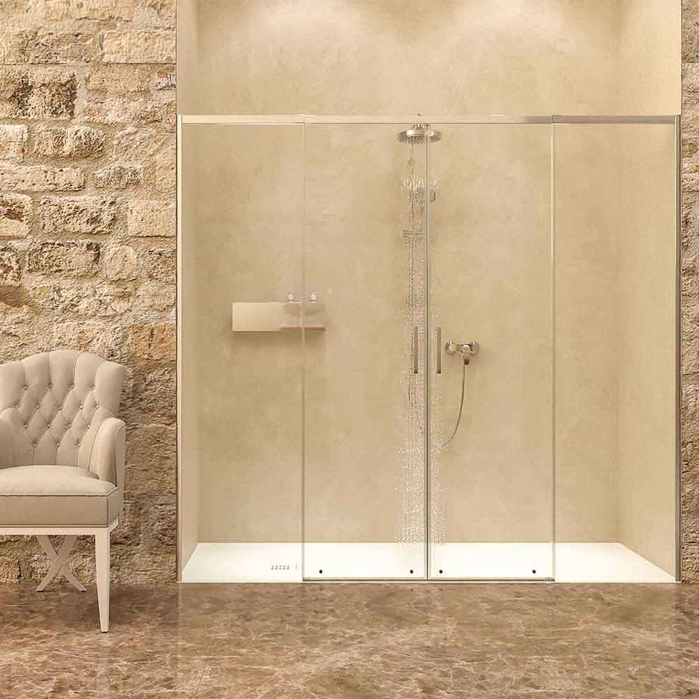 Mampara de ducha AXER frontal 2 fijos – 2 puertas correderas vidrio 6 mm. ACERO INOXIDABLE