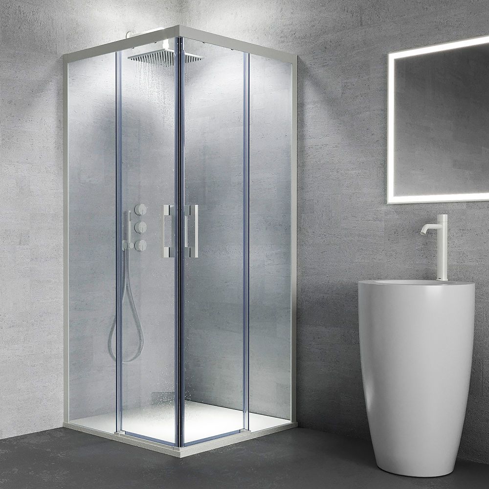 - Se compone de 2 hojas fijas y 2 correderas. Es perfecta para salvar obstáculos cercanos al plato y además, su doble puerta corredera, permite un espacio de entrada por el vértice del plato muy amplio y cómodo.