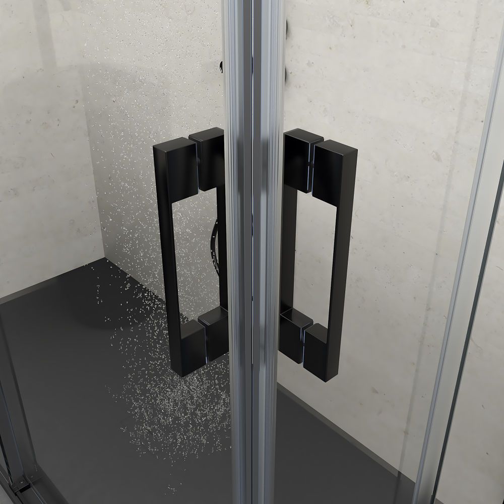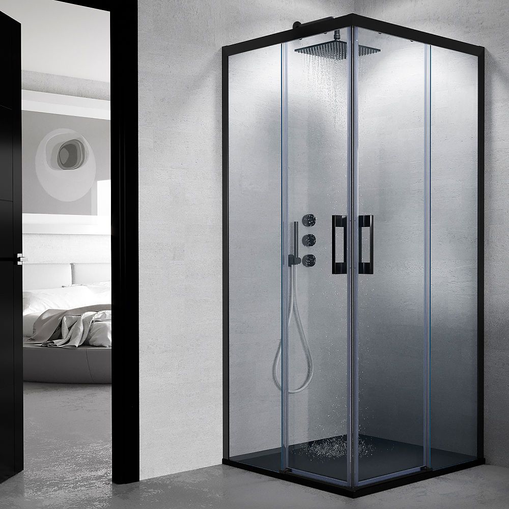 - La perfilería de esta mampara de baño es de aluminio anodizado negro mate, lo que, junto a las líneas depuradas y a su tirador a juego, confiere una sensación de amplitud y luz ante la que es imposible resistirse.