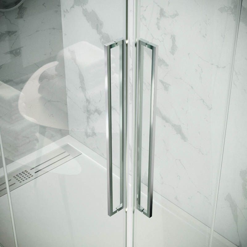 Frontal de ducha compuesto por dos hojas abatibles hacia el exterior, dejando una gran apertura en espacios reducidos. La hoja pivota sobre el eje compuesto por una pinza en la parte inferior y superior de la mampara. Este novedoso sistema garantiza una larga durabilidad de la mampara por su sencillo mecanismo. Es muy recomendado para frontales pequeños comprendidos entre 30 y 120 cms. Es conveniente asegurarse que no haya ningún impedimento al abatir la hoja hacia afuera, confirmando así que los sanitarios o el lavabo no impida abrir la hoja con total seguridad. Los perfiles son de aluminio anodizado en plata alto brillo, especialmente tratado para estar en contacto con el agua y la humedad, y el vidrio es templado de seguridad de 6mm en transparente. ¡Incluye un tratamiento anti-cal en los cristales ! Sistema de fácil limpieza. Modelo de mampara reversible tanto a derechas como izquierdas. Fácil instalación.