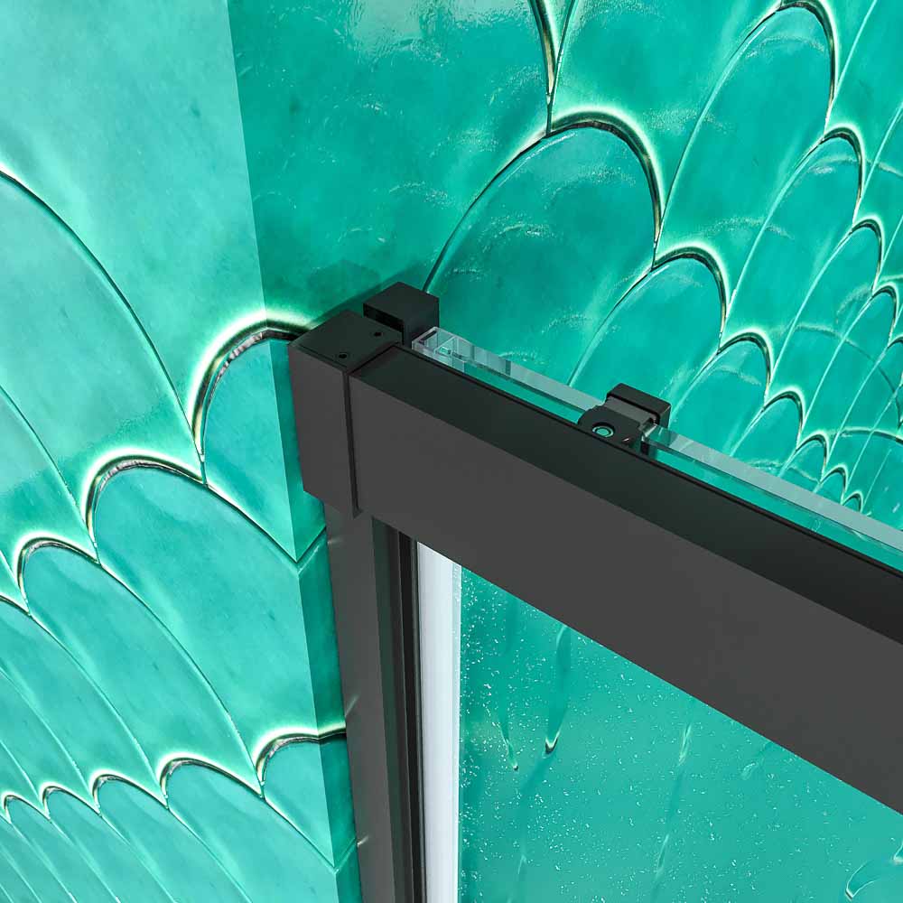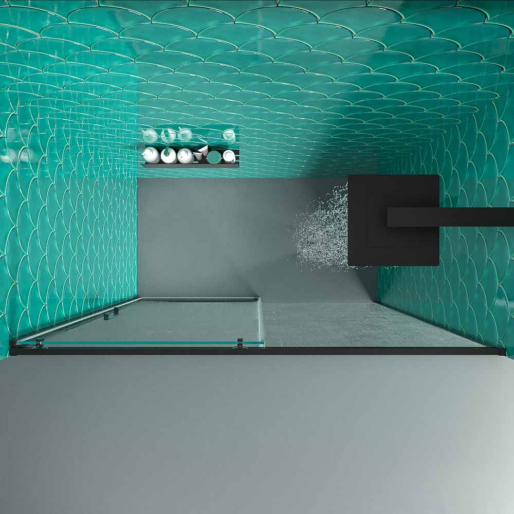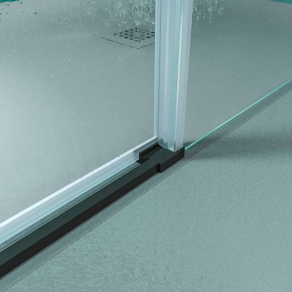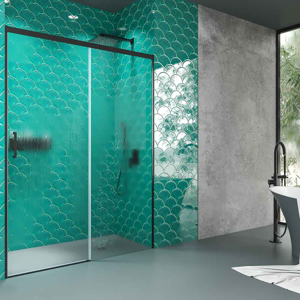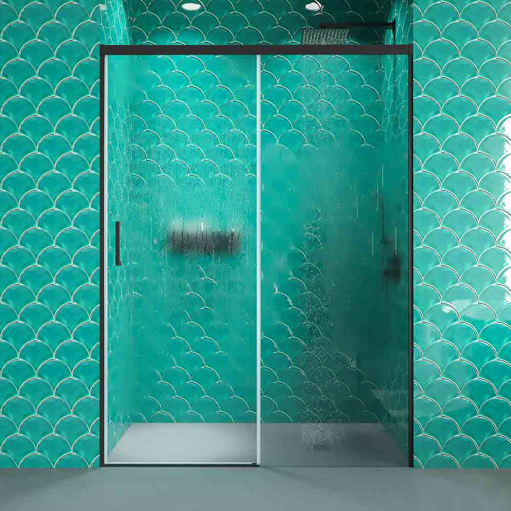 • Mampara de ducha frontal 1 fijo – 1 puerta corredera sin perfil inferior, perfil negro mate, cristal templado 6 mm de seguridad , altura 195 cm.