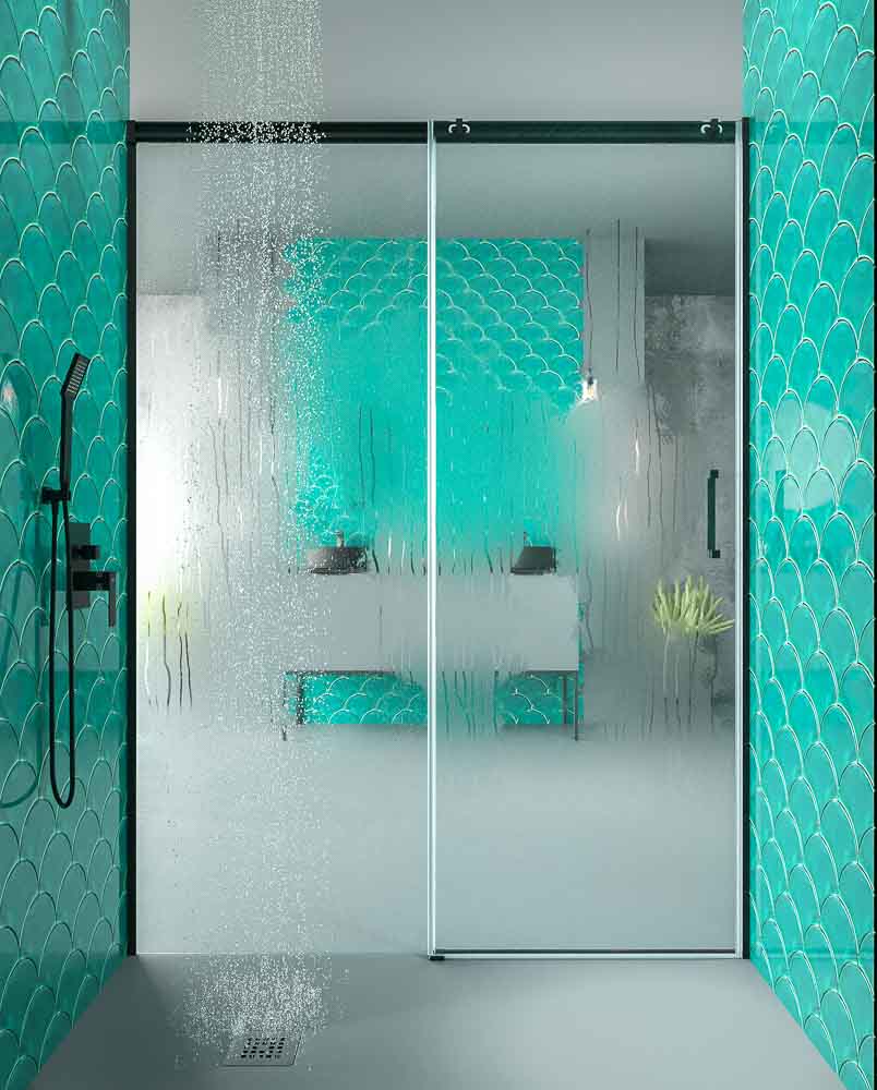 El vidrio templado es de 6 mm de grosor, disponible en acabado transparente . Lleva el anti-cal de serie, que repele las gotas de agua hacia el plato para evitar la incrustación de cal que termina dañando los cristales.