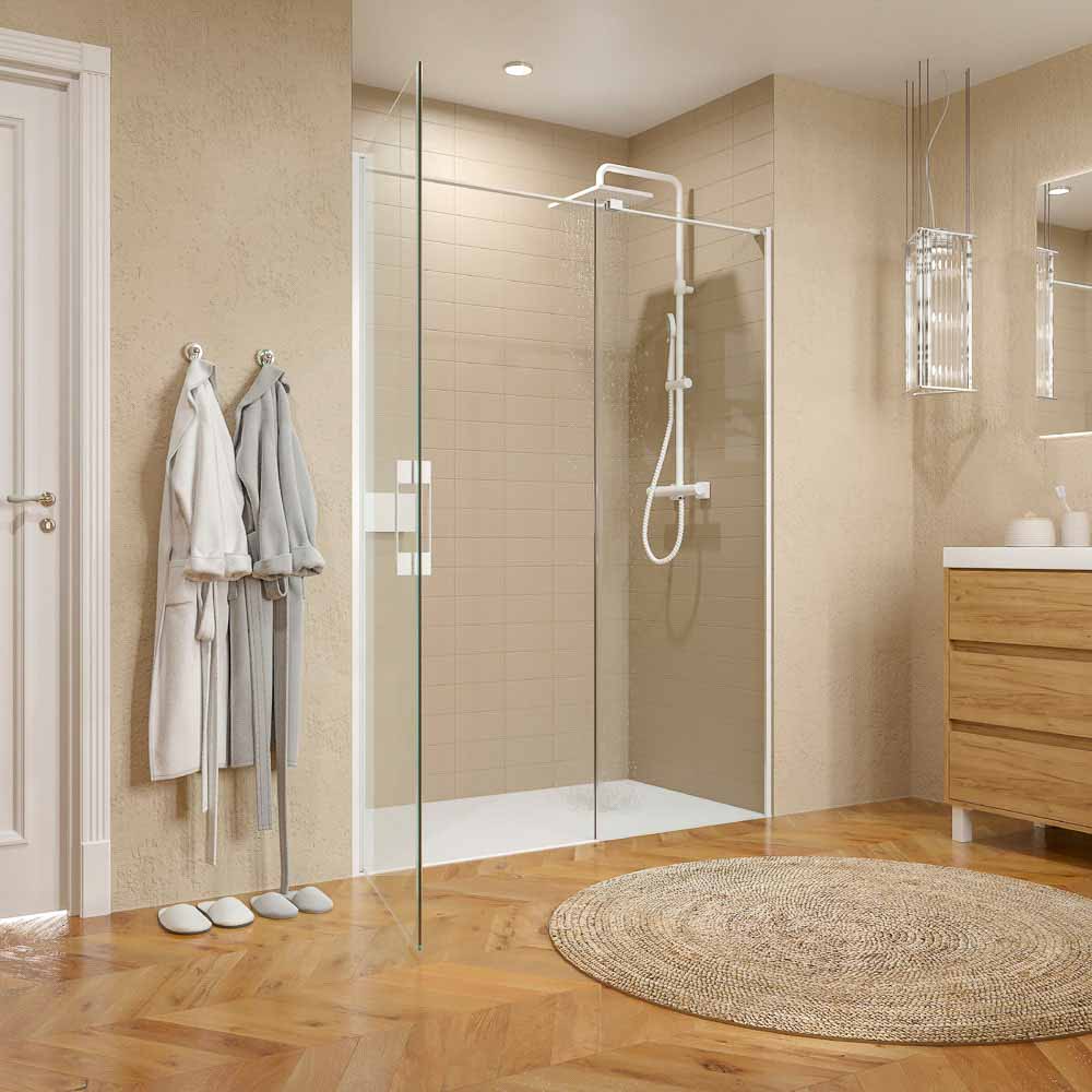La mampara frontal de ducha OPEN solo lleva perfiles de aluminio en los lados, nada por arriba ni por abajo. Es un conjunto sencillo y discreto, que hará crecer la estancia con sus cristales templados de 6 mm.