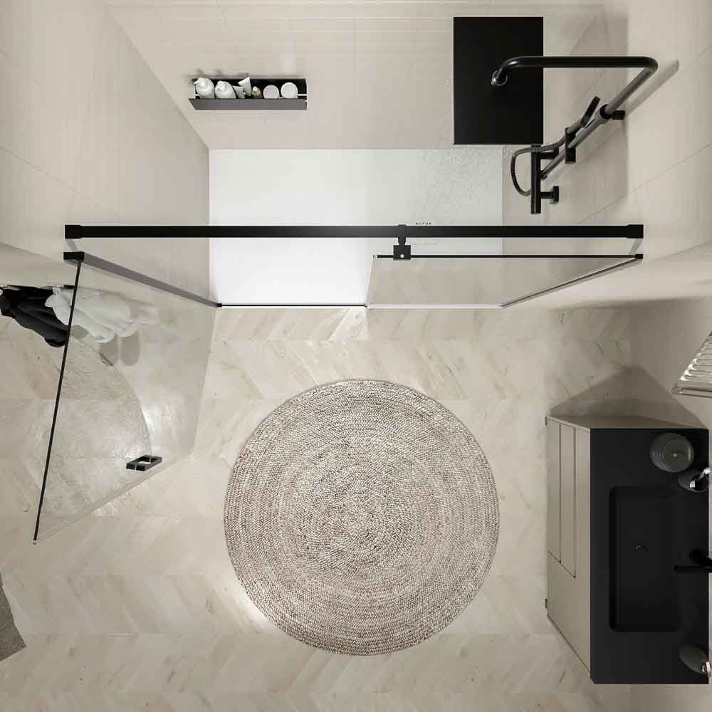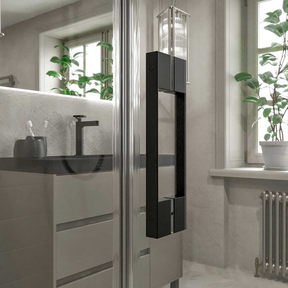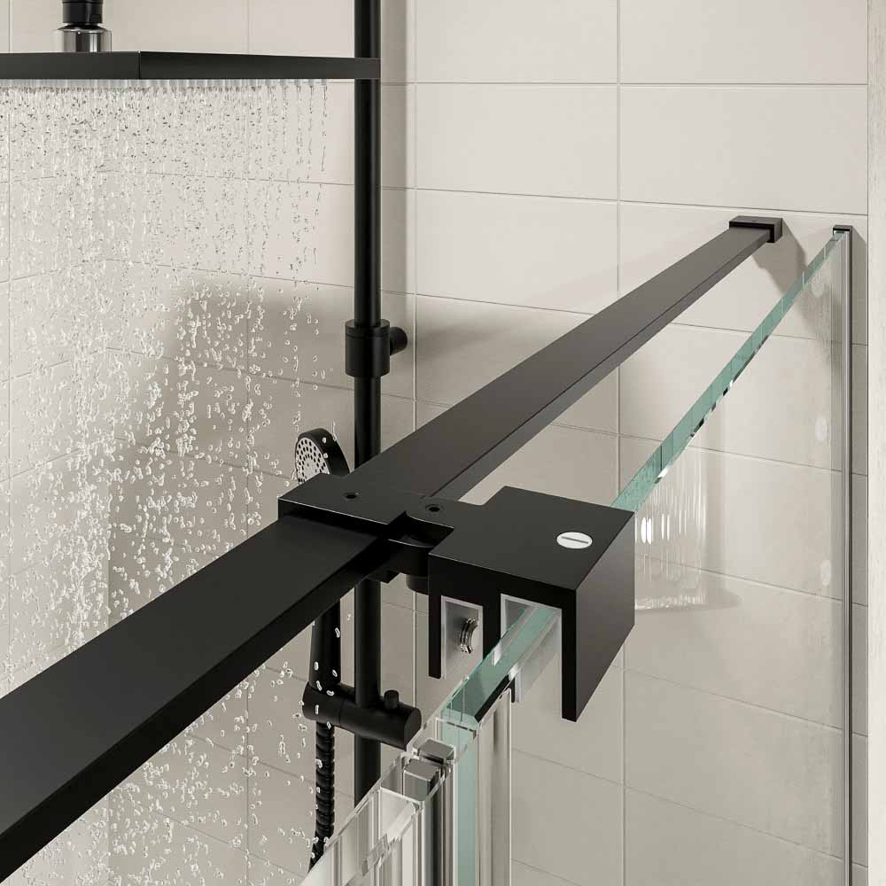 Su tirador minimalista combina con el aspecto depurado de la mampara, que incorpora un brazo de sujeción a pared para conseguir que el fijo frontal no cimbree.