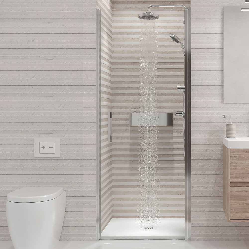 Si la limpieza y la accesibilidad priman a la hora de decidir qué mampara de ducha elegir, te recomendamos tener muy en cuenta las de apertura abatible. Eso sí, necesitas no tanto un baño grande como no muy abigarrado, que te permita abrir la puerta hacia afuera y hacia dentro sin golpear con ningún mueble de baño o sanitario. Si es tu caso y además el plato de ducha se encuentra entre tres paredes, lo mejor es decantarse por un frontal de ducha de apertura abatible 180 grados.