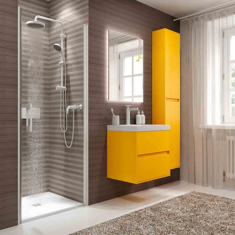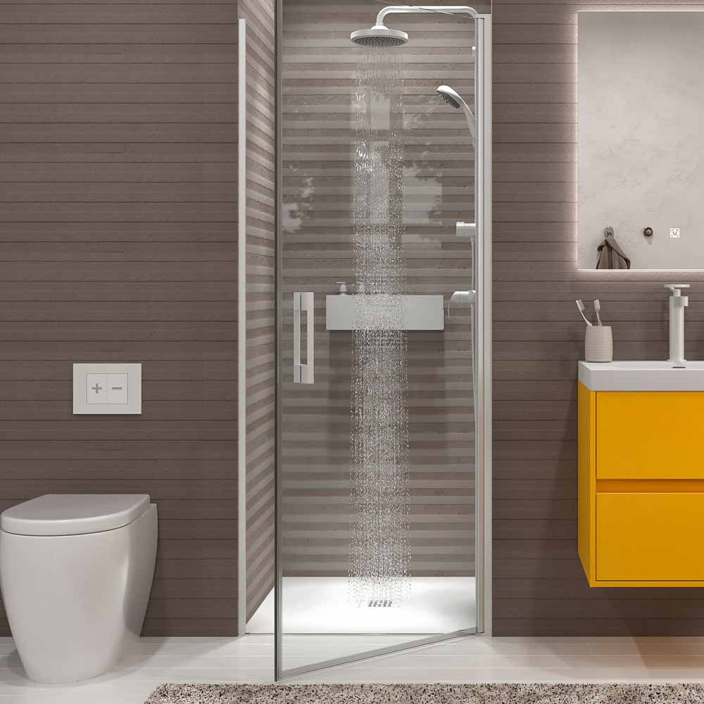 Si la limpieza y la accesibilidad priman a la hora de decidir qué mampara de ducha elegir, te recomendamos tener muy en cuenta las de apertura abatible. Eso sí, necesitas no tanto un baño grande como no muy abigarrado, que te permita abrir la puerta hacia afuera y hacia dentro sin golpear con ningún mueble de baño o sanitario. Si es tu caso y además el plato de ducha se encuentra entre tres paredes, lo mejor es decantarse por un frontal de ducha de apertura abatible 180 grados.