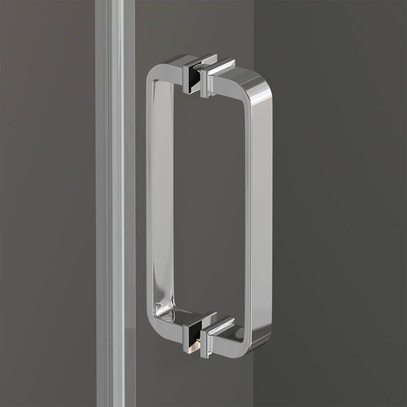 La perfilería de aluminio anodizado en acabado cromo brillo de esta mampara de ducha, el original tirador a juego, el amplio panel de cristal templado transparente en 8 mm., aumenta visualmente la estancia, especialmente si es pequeña.