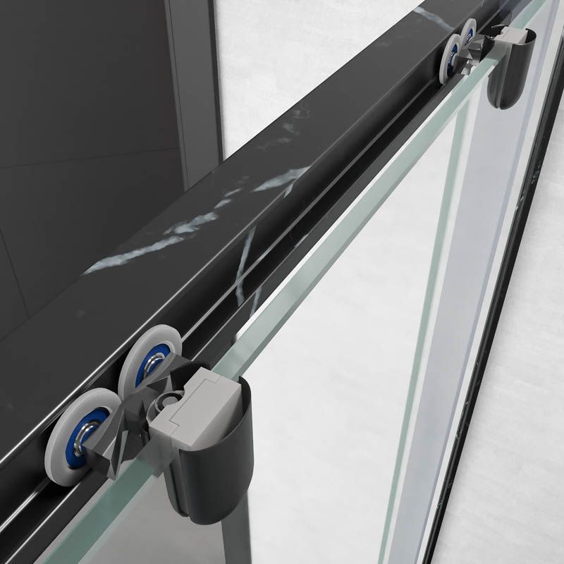 La perfilería de esta mampara de baño es de aluminio negro marquina, lo que, junto a las líneas depuradas y a su tirador a juego, confiere una sensación de amplitud y luz ante la que es imposible resistirse.