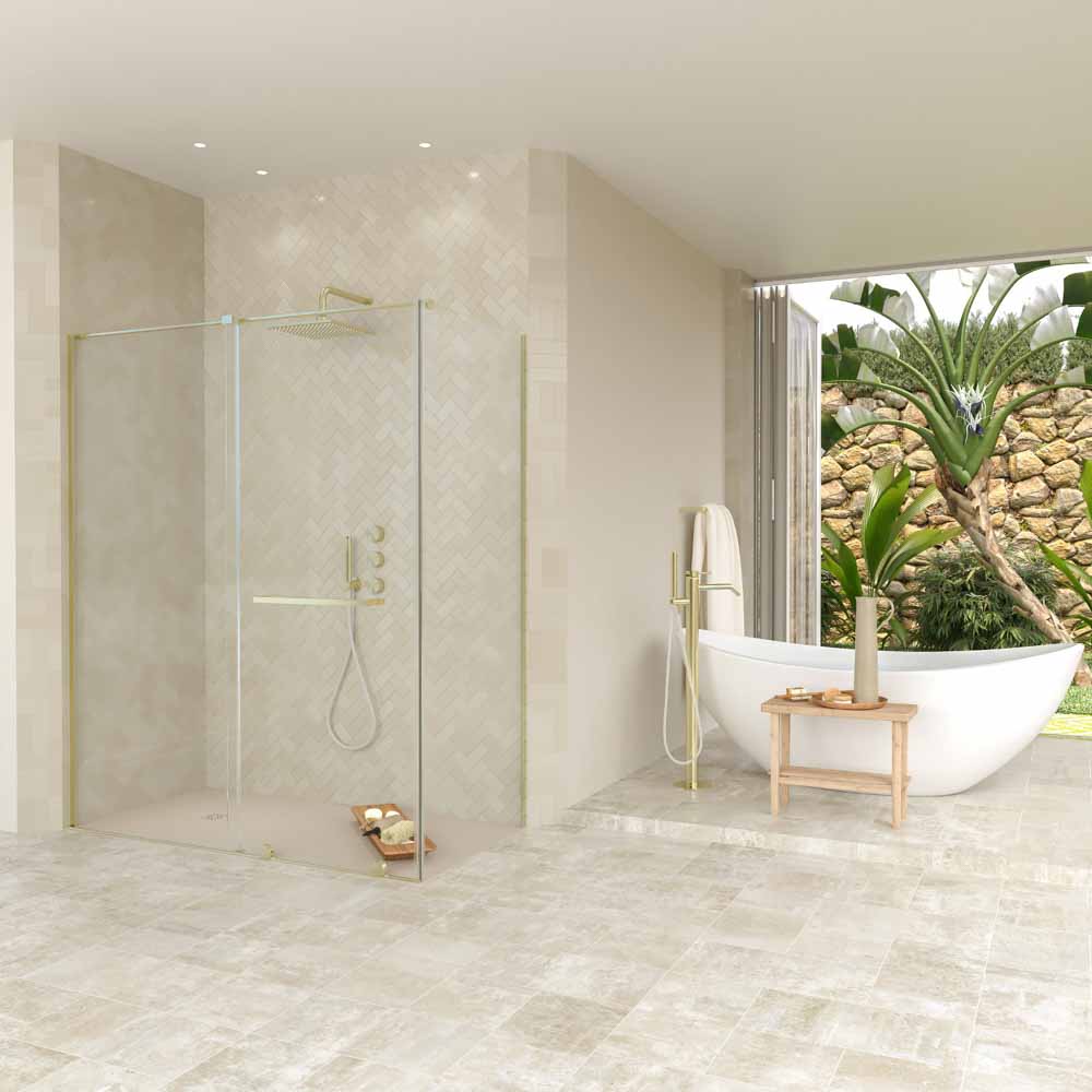 Perfilería disponible en oro mate, especialmente tratado para estar en contacto con el agua y la humedad.