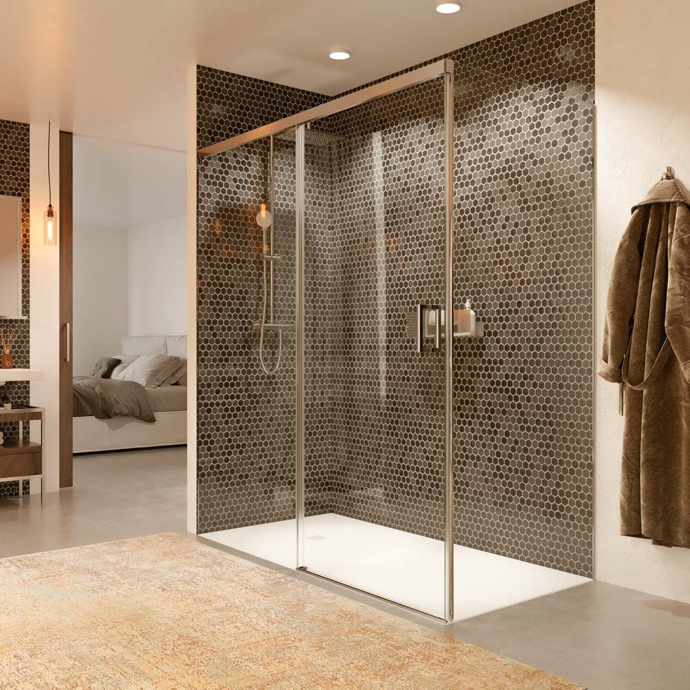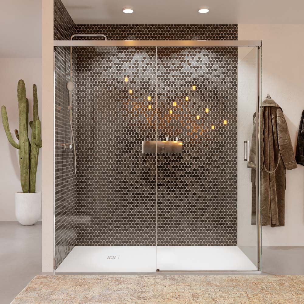 - Recomendable especialmente para platos de ducha cuyo frontal sea mayor de 100 cms, para que deje un espacio de entrada mínimo de 50cms.
