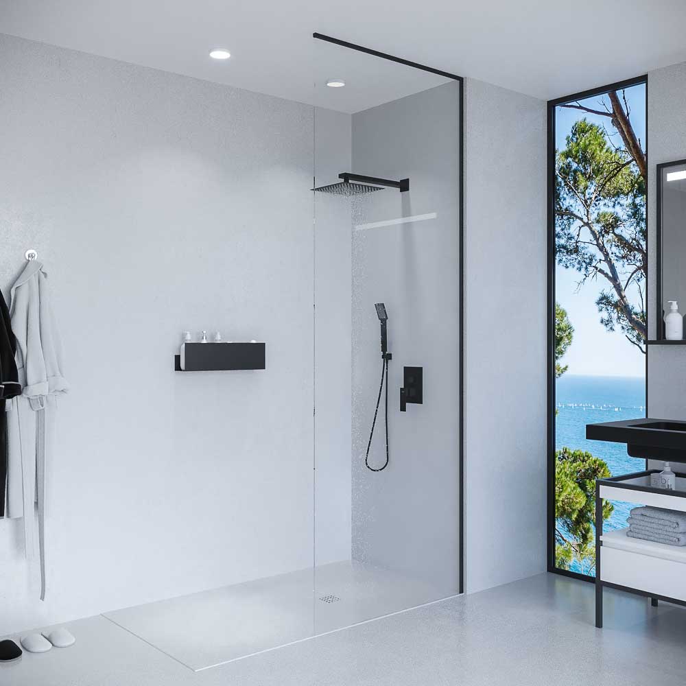 Esta mampara de ducha se compone de un único panel fijo de cristal templado de 8 mm de espesor. Esta composición encaja en todo tipo de baños, de todos los tamaños.