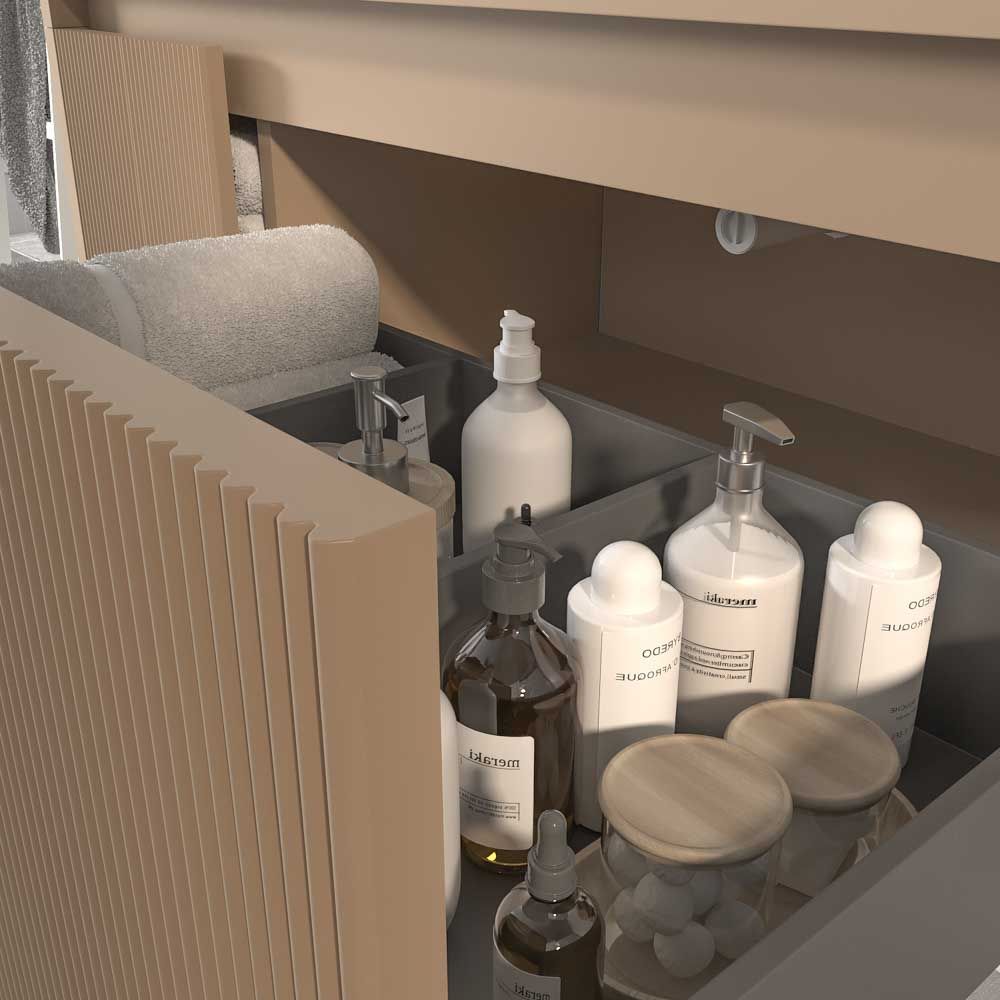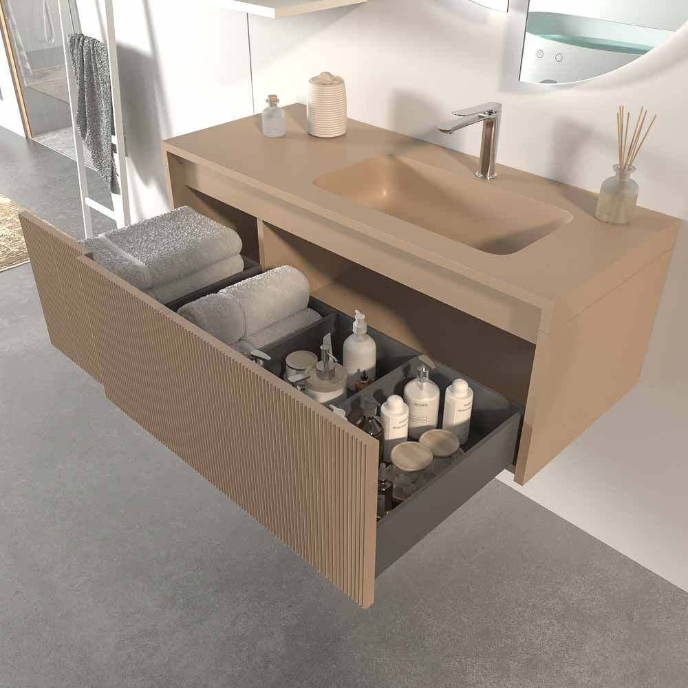 Los muebles de baño suspendido con cajones con separadores son ideales para almacenar todos los enseres de baño en orden. Las medida del mueble son de 90 cm / 110 cm de ancho x 45 cm de fondo x 40 cm de alto.