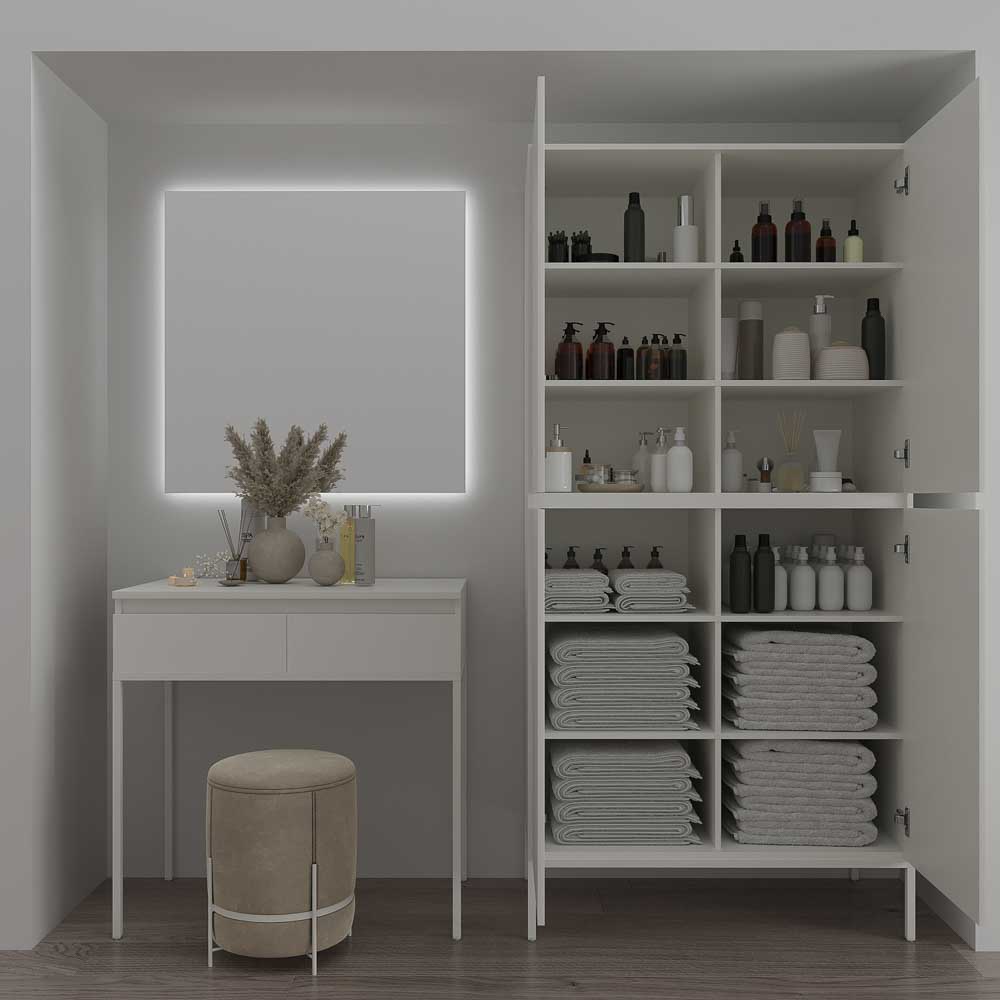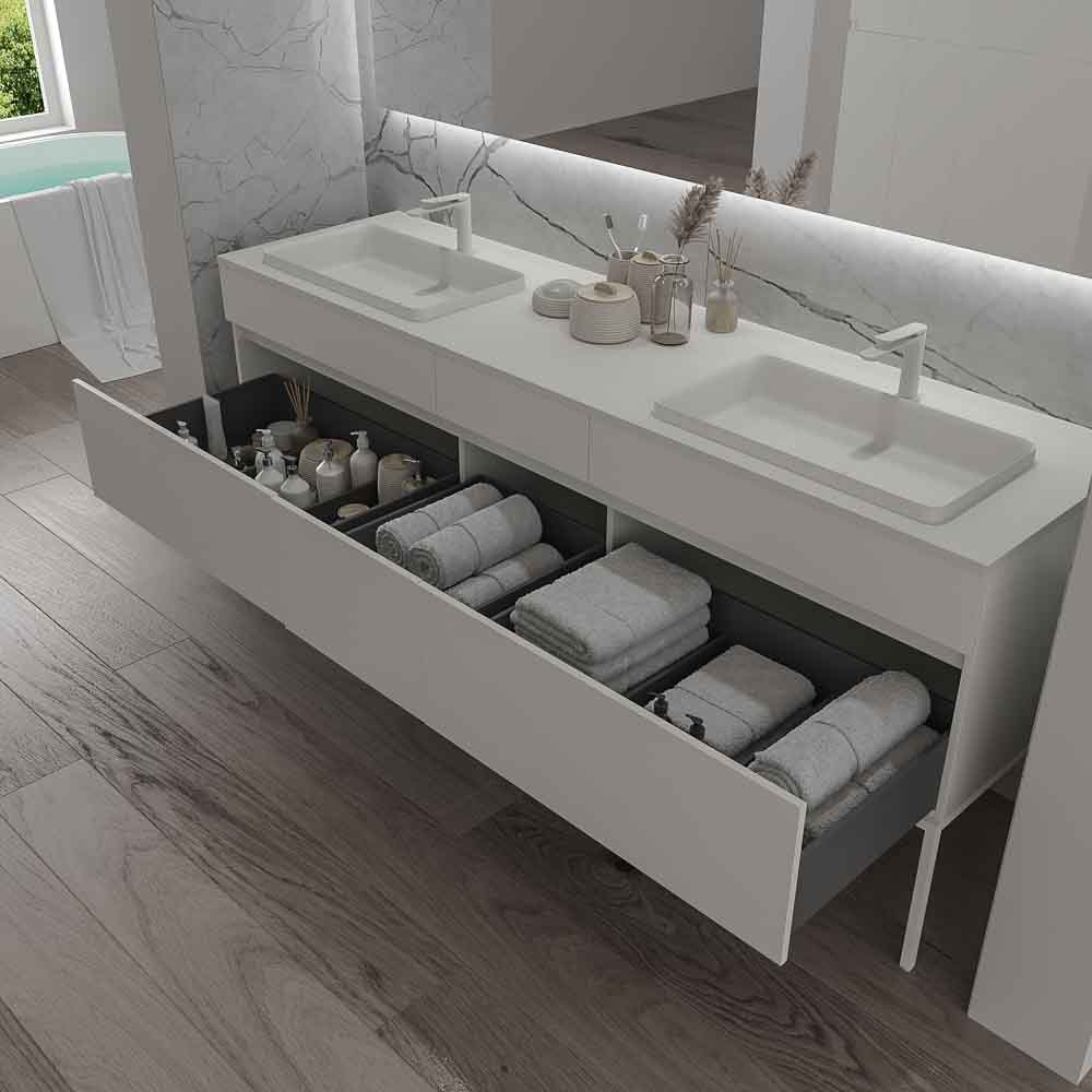 El mueble de baño DUNE de estilo minimalista de Varobath te proporciona un estilo de decoración muy elegante para tu baño. Con variedad de medidas y en diferentes acabados, este modelo te permite decorar tu baño, aprovechar el espacio y disponer de un sitio para guardar tus productos de higiene.