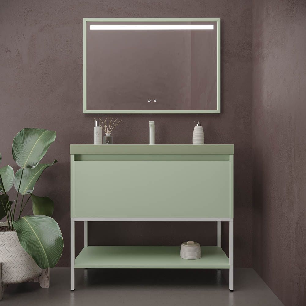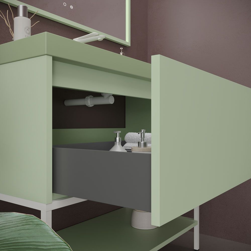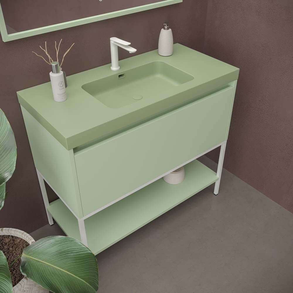 Varobath mueble bano con patas ELE 100 cm verde blanquecino.jpgMueble de baño ELEN con patas 1 cajón – 1 balda inferior VERDE BLANQUECINO / BLANCO
