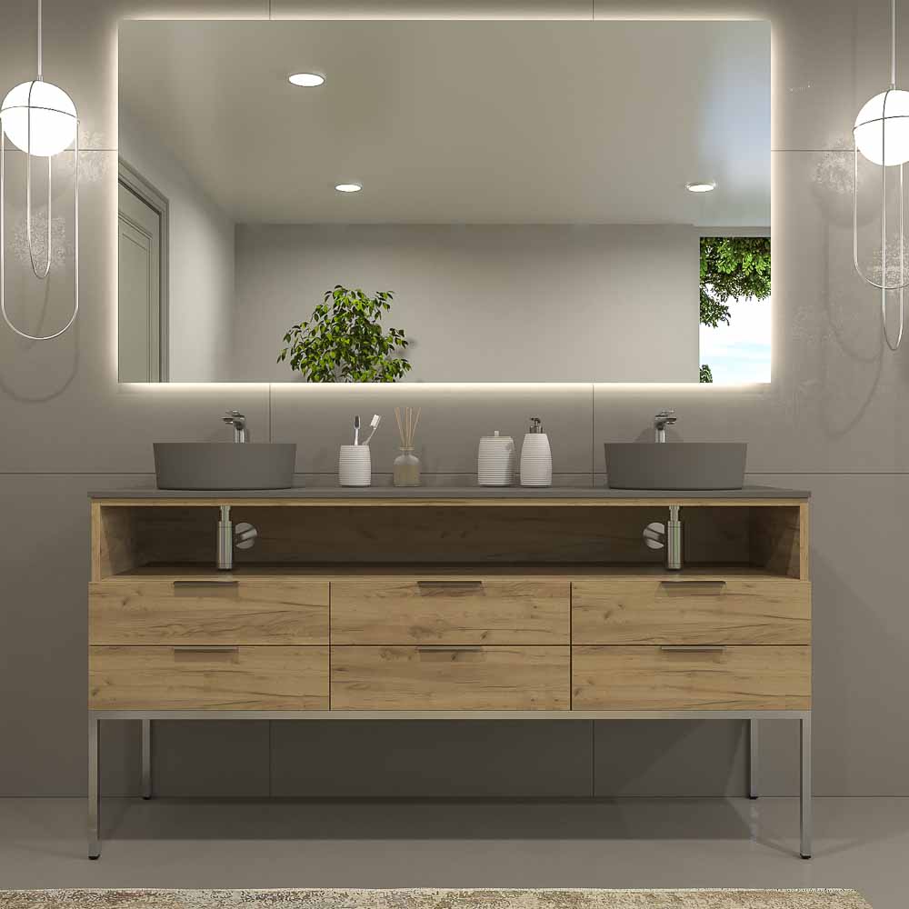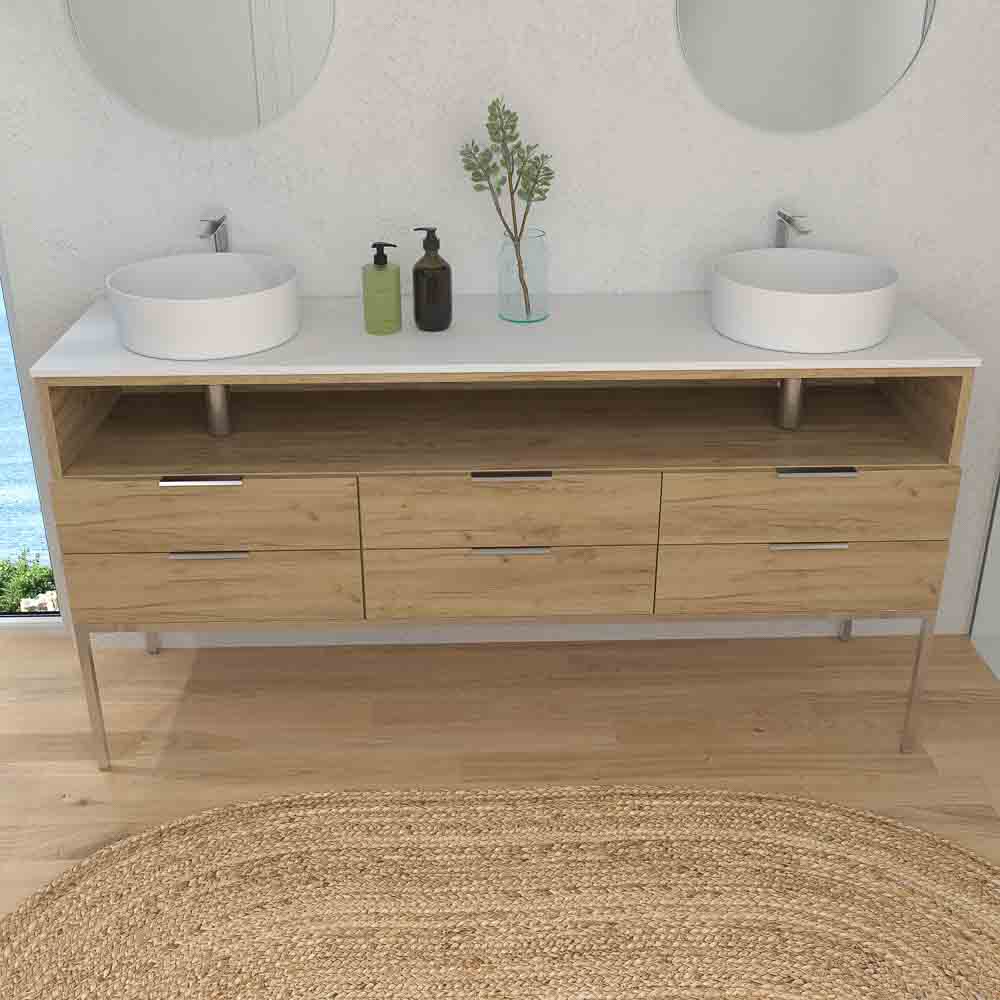 Mueble de baño ELLA con patas 6 cajones – 1 hueco con tapa SOLID SURFACE 2 lavabos ROBLE CLARO