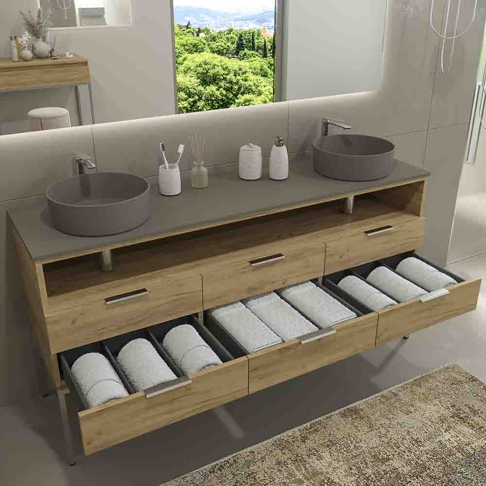 Varobath Mueble ELLA 6 cajones 1 hueco ROBLE CLARO.jpgMueble de baño ELLA con patas 6 cajones – 1 hueco con tapa SOLID SURFACE 2 lavabos ROBLE CLARO