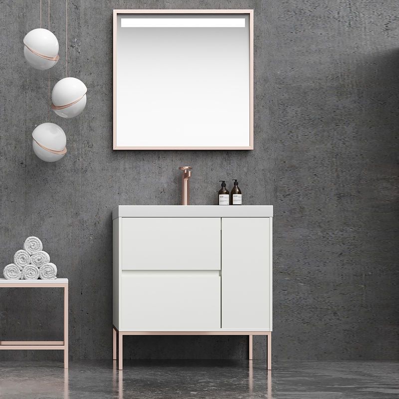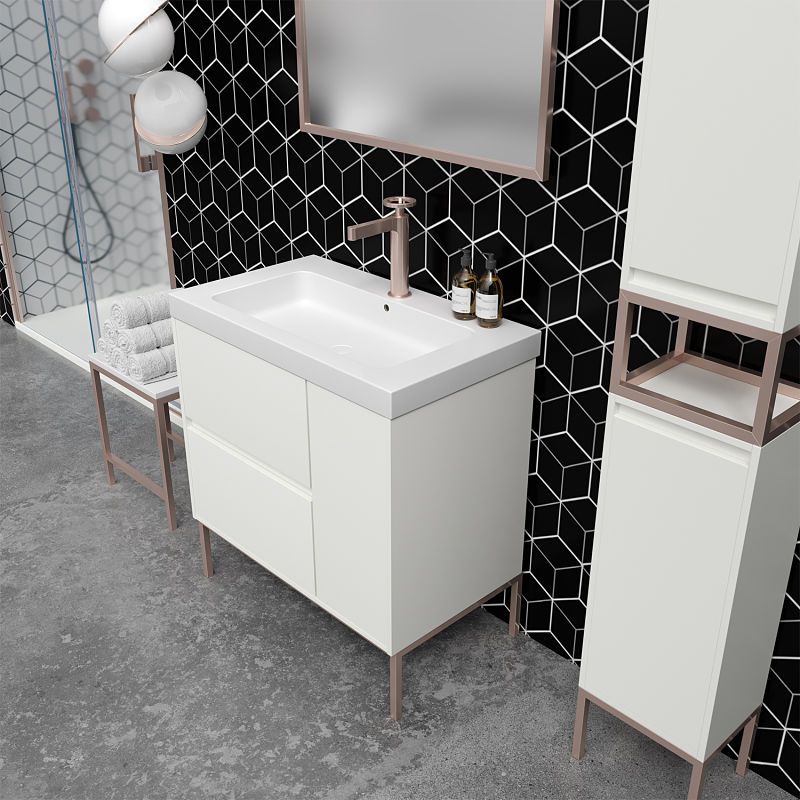 Instalación: El mueble se sirve ensamblado y viene acompañado de patas de aluminio acabadas en negro, blanco, oro, oro rosa, cromo y cobre. Estas patas quedarán decorativas con el color del mueble de baño.