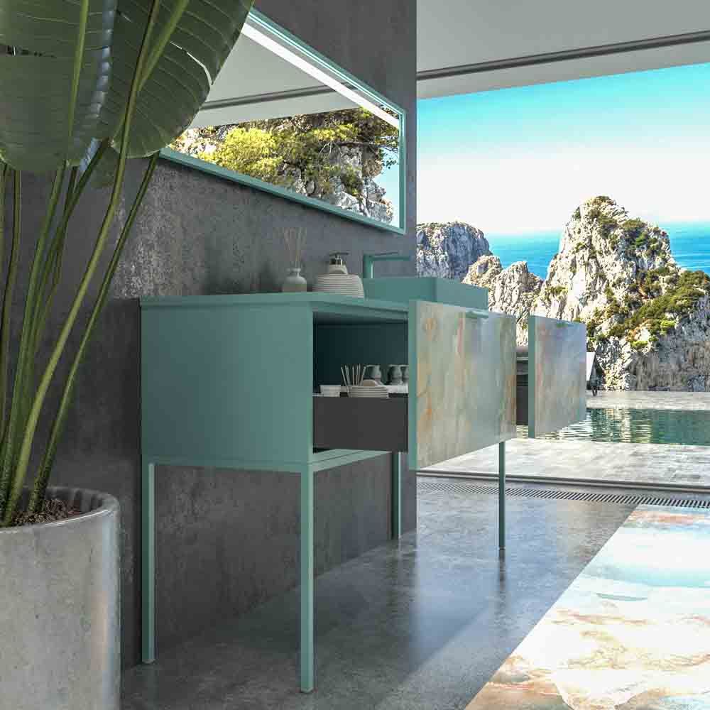 Para completar el mueble de baño de diseño, la encimera de SOLID SURFACE con lavabo FOGO se puede acabar en la mismo color del mueble y puedes añadir espejos enmarcados en aluminio exactamente igual al color del mueble. Combina con todos los tipos de espejos de nuestro catalogo.
