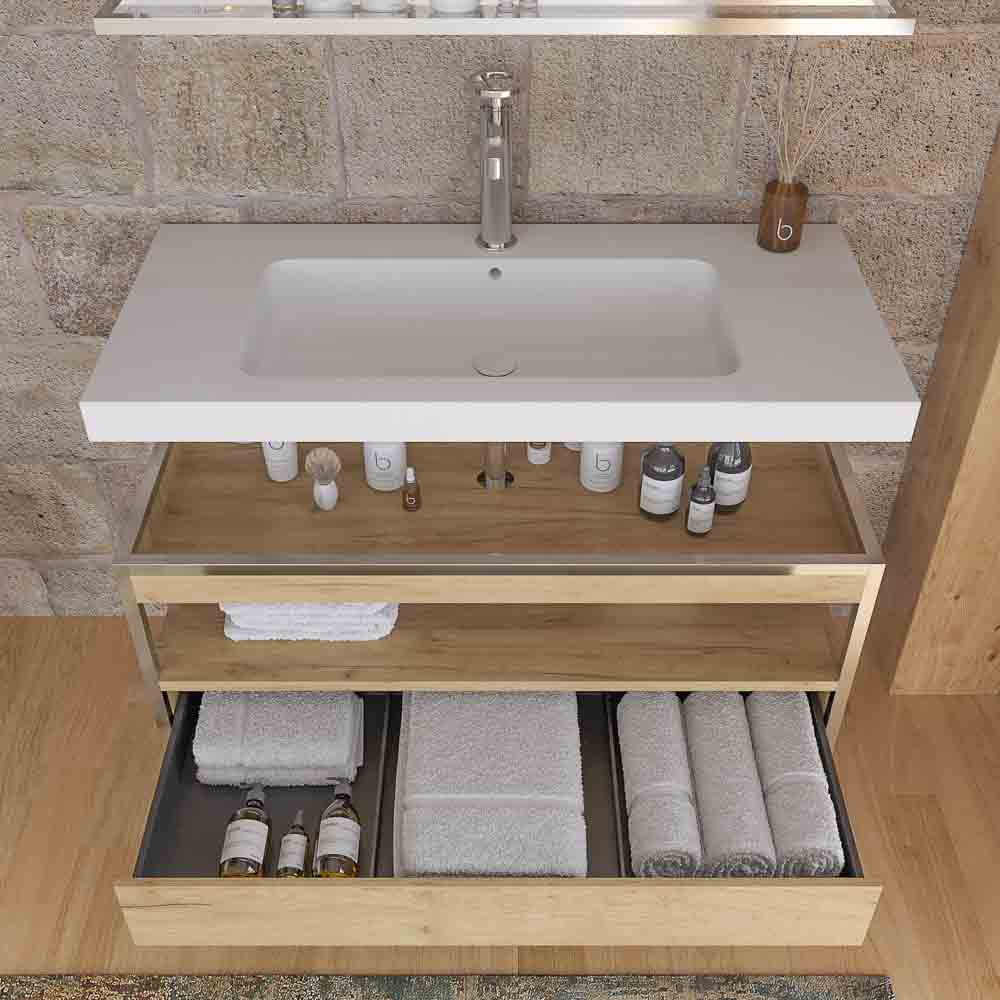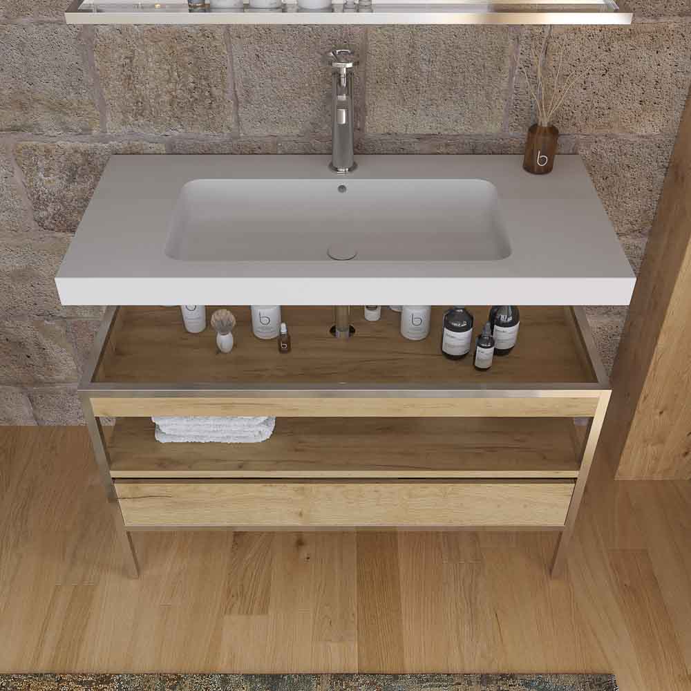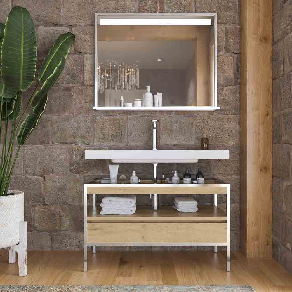 El conjunto de baño industrial INDEX es un mueble de baño versátil y personalizable. Puedes elegir entre las medidas de 60, 80 o 100 cm de ancho. La altura es de 85 cm, de los cuales 12 cm corresponden a las patas (integradas en la propia estructura de aluminio).