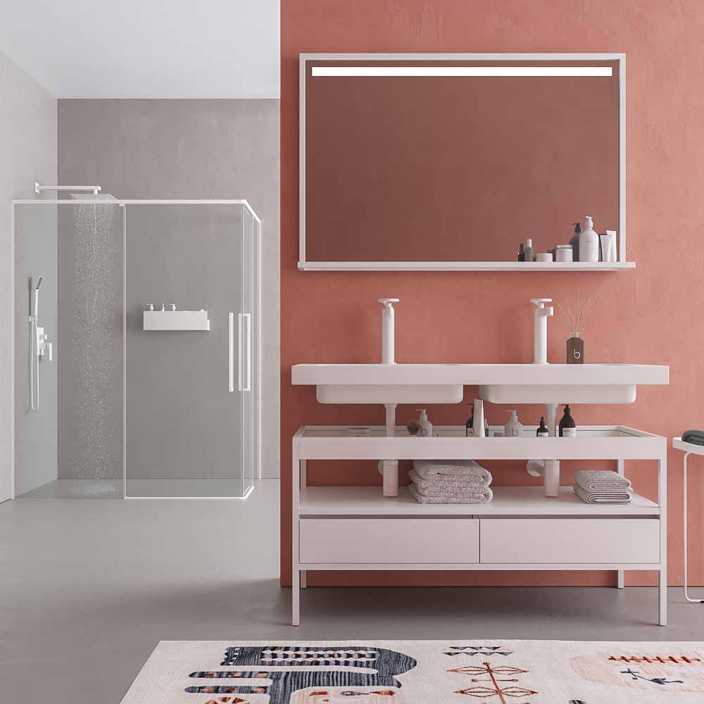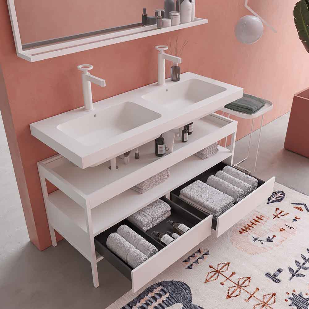 El conjunto de baño industrial INDEX es un mueble de baño versátil y personalizable. Puedes elegir entre las medidas de 60, 80 o 100 cm de ancho. La altura es de 85 cm, de los cuales 12 cm corresponden a las patas (integradas en la propia estructura de aluminio).