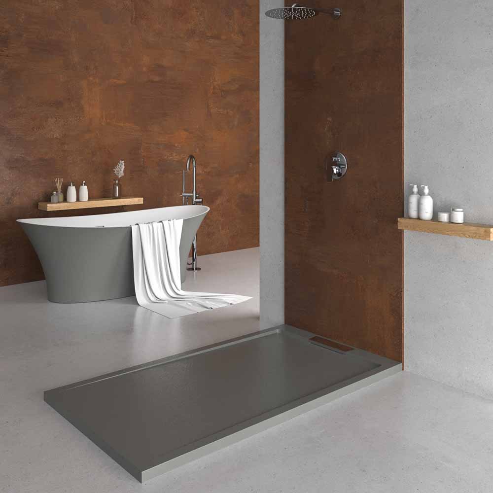 El plato de ducha hecho con resinas de última generación modelo STYLE en color Gris Cemento, presenta un diseño moderno, vanguardista y único. Es la fusión entre un plato liso y uno con marco. Esta acabado en GEL COAT antibacteriano y textura pizarra. Se puede cortar a la medida. La rejilla oculta una válvula de gran caudal.